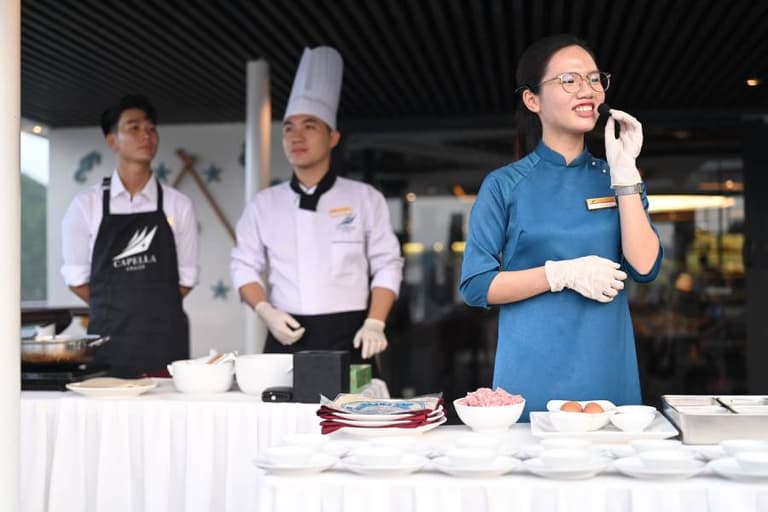 After watching the sunset, guests can enjoy a gourmet dinner at the Harmony of the Sea restaurant with a menu of over 100 dishes, ranging from Asian to European cuisine, accompanied by many enticing seafood dishes caught right in the waters of Halong.