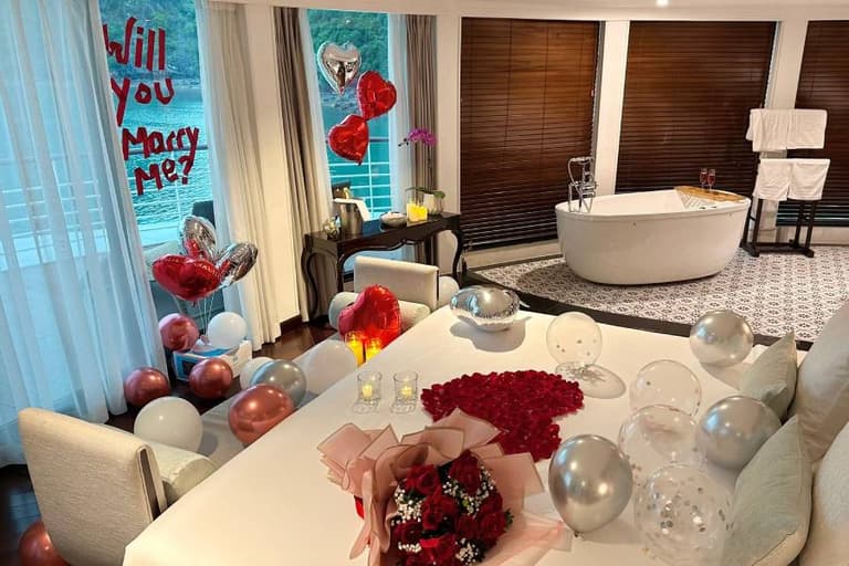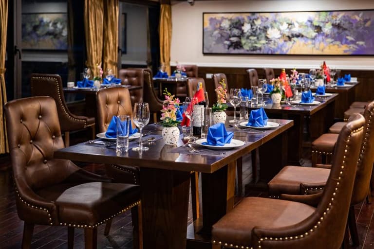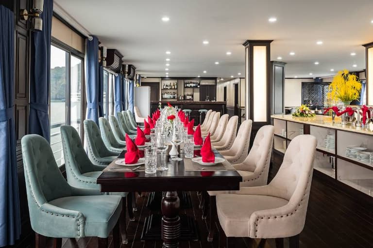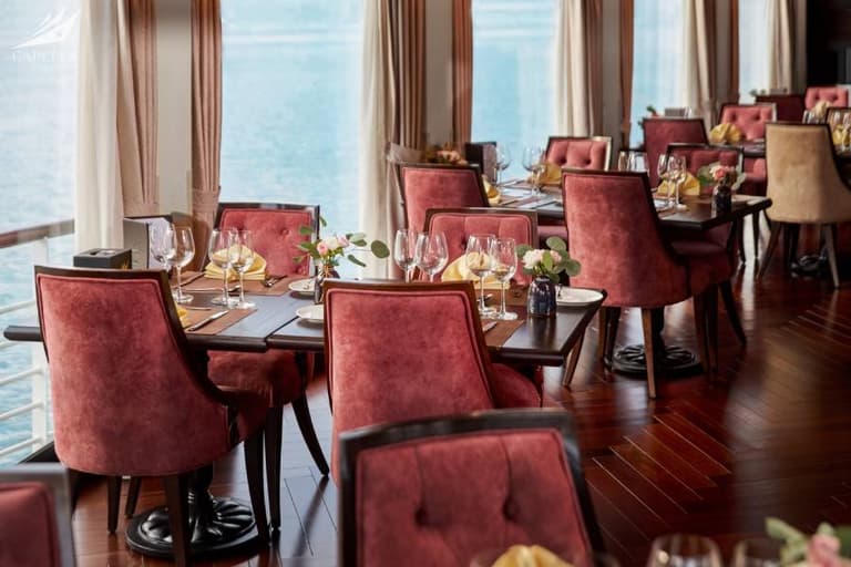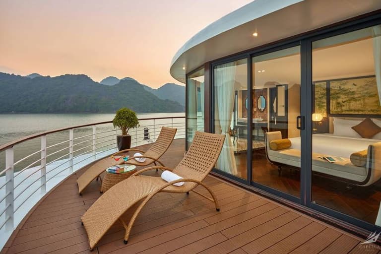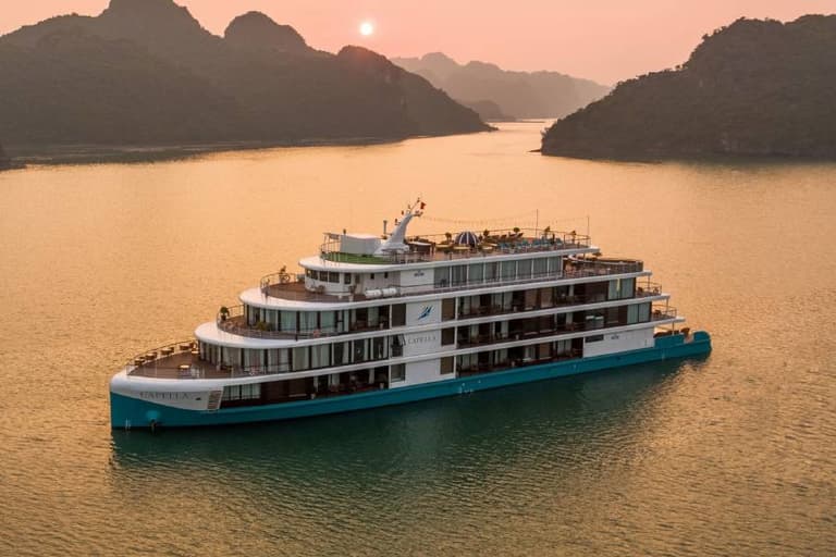 Anyone who has experienced the Capella 1 night cruise Halong Bay won’t soon forget it. The exterior of the Capella cruise is painted in a harmonious blue and white, creating a striking presence amidst the sea and sky of Halong Bay.