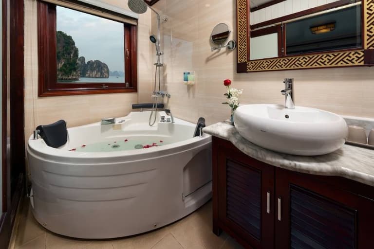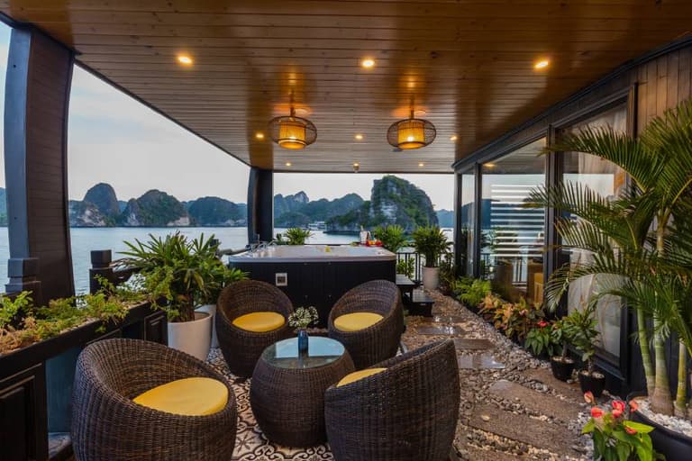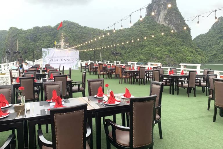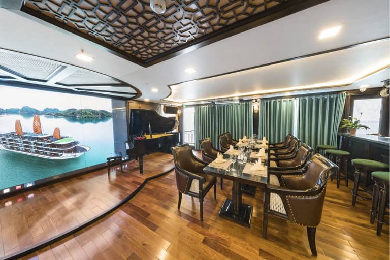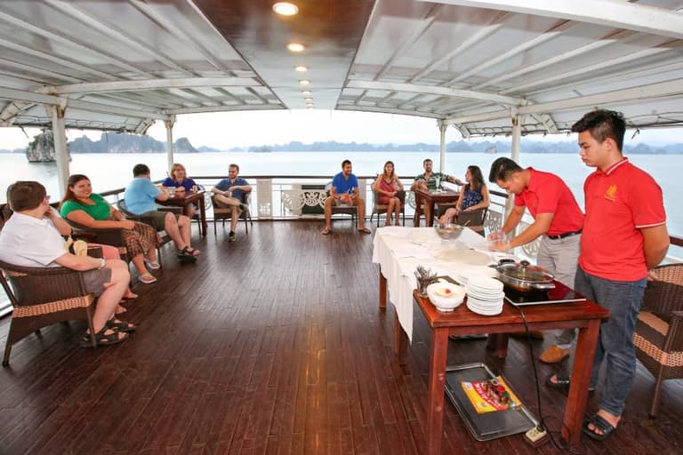 When dusk falls, guests can enjoy Halong Bay’s nightlife by immersing themselves in music and enjoying drinks from the bar. People also often participate in the squid fishing challenge on the deck. When joining this activity, please contact the manager for assistance with necessary equipment.