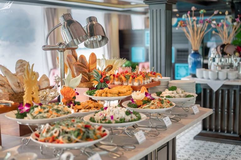 - Quality Meals: The 1 night cruise Halong Bay provides traditional Vietnamese dishes and international cuisine. Seafood ingredients are sourced directly from Halong Bay’s fishing villages, ensuring freshness and cleanliness. If guests have seafood allergies or underlying health conditions, they can enjoy lighter dishes such as grilled ribs and mixed steamed vegetables.