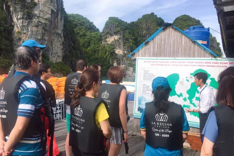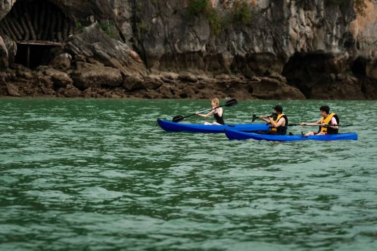 The cruise will anchor in a safe area near Tra Bau. Tra Bau is famous for its narrow waterways, flanked by towering limestone cliffs on both sides. Surrounding the floating houses are local fish, oyster, and shrimp farms. Therefore, kayaking here will help guests clearly feel the nature and life of the residents.