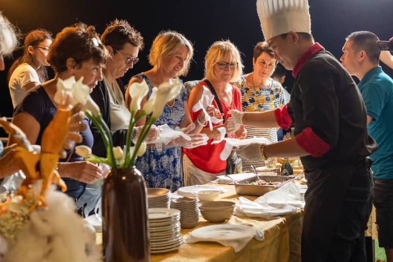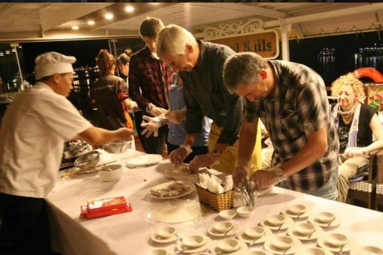 In the evening, the cruise will become more lively with entertainment activities such as playing cards, Chinese chess, or dominoes, creating refreshing laughter and memorable experiences. You can also try their luck with squid fishing. The crew will prepare the catch directly for guests to enjoy the crisp, chewy texture of this dish.