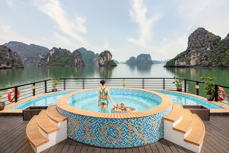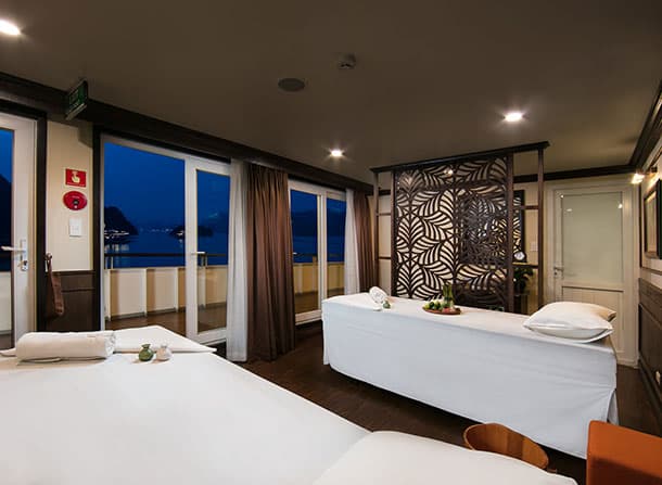 For perfection, you can immediately think of Peony Cruise, a yacht that offers both diverse itineraries and quality spa services. The cruise has 40 cabins, so the number of guests won’t be small. Therefore, if you wish to relax with spa services, you should register with the manager before boarding the cruise or immediately upon check-in.