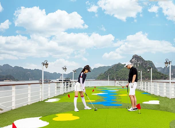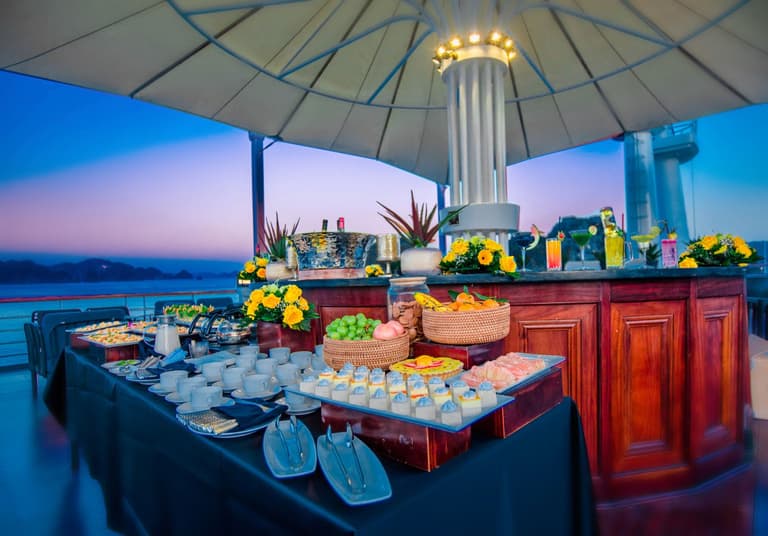 After dinner, you’ll enjoy the peaceful scenery of Lan Ha Bay on the deck. You can also participate in activities like bamboo dancing, the “Steps of Heritage” ethnic fashion show, enjoy drinks at the Sky Bar, and indulge in a complimentary herbal foot soak (one packet per room).