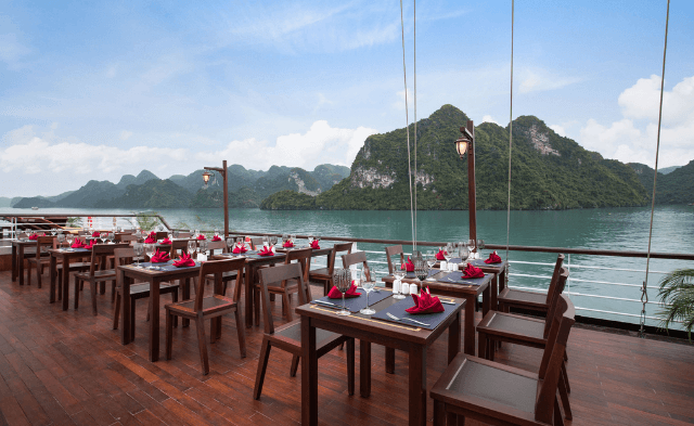 Amanda Luxury Lanha may not be vast in size, but it offers a full range of amenities including a swimming pool, balcony, bar, and restaurant. You can enjoy relaxing moments sipping traditional Vietnamese tea or coffee on the sundeck. The cruise often hosts evening parties featuring local cuisine, with tables adorned with candles and flowers, creating a romantic setting for couples.