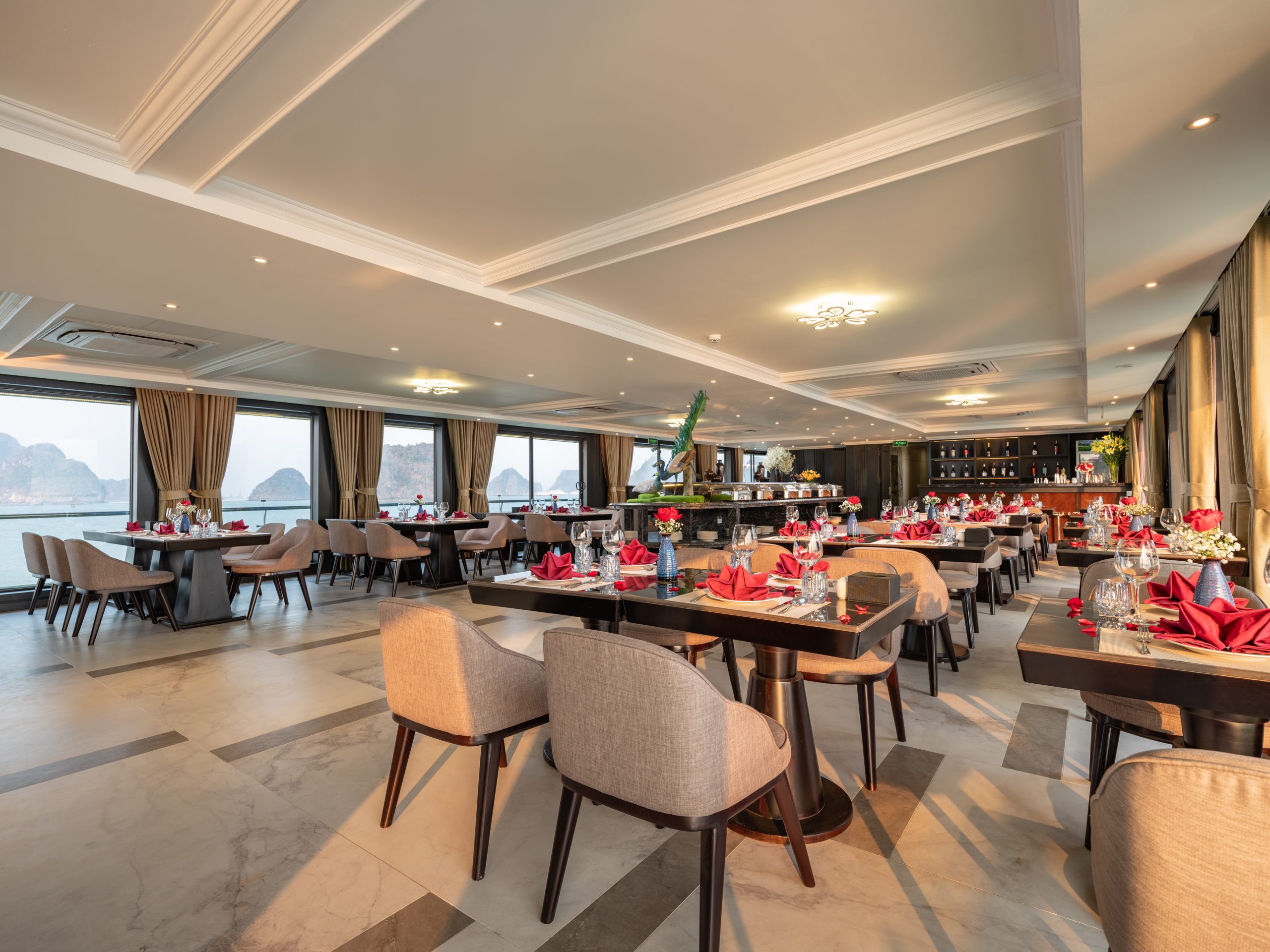 Dinner on the cruise is always a wonderful time for couples. Under the soft candlelight and cool sea breeze, you’ll savor a blend of Vietnamese and international dishes. The menu typically includes squid cakes, jellyfish salad, and grilled oysters with scallion oil. Each dish embodies the savory flavors of the sea and the meticulous preparation of the chefs.