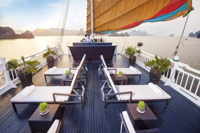 The most luxurious and pretigious 5 Star Cruise in Ha Long Bay Hera – The Queen of the Gods, patron of marriage and fertility, the cruise ship is impressively designed in white, predominantly using high-quality wood with a distinctive fragrance. The design is a combination of both Eastern and Western cultures, which is luxurious, convenient, exquisite/sophisticated and meticulously detailed.