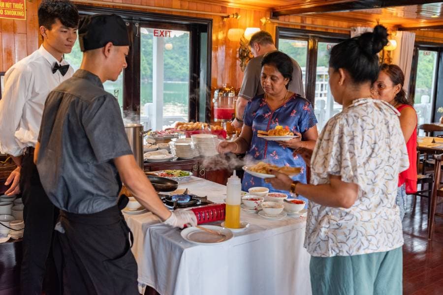 Activities: Kayaking or bamboo boat in Luon cave, Visiting Sung Sot cave, Swimming or climbing on Titop island to see the whole Ha Long Bay, Cooking class: Traditional Vietnamese floating rice cake
