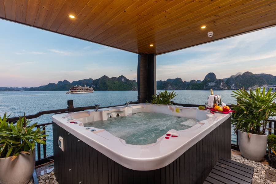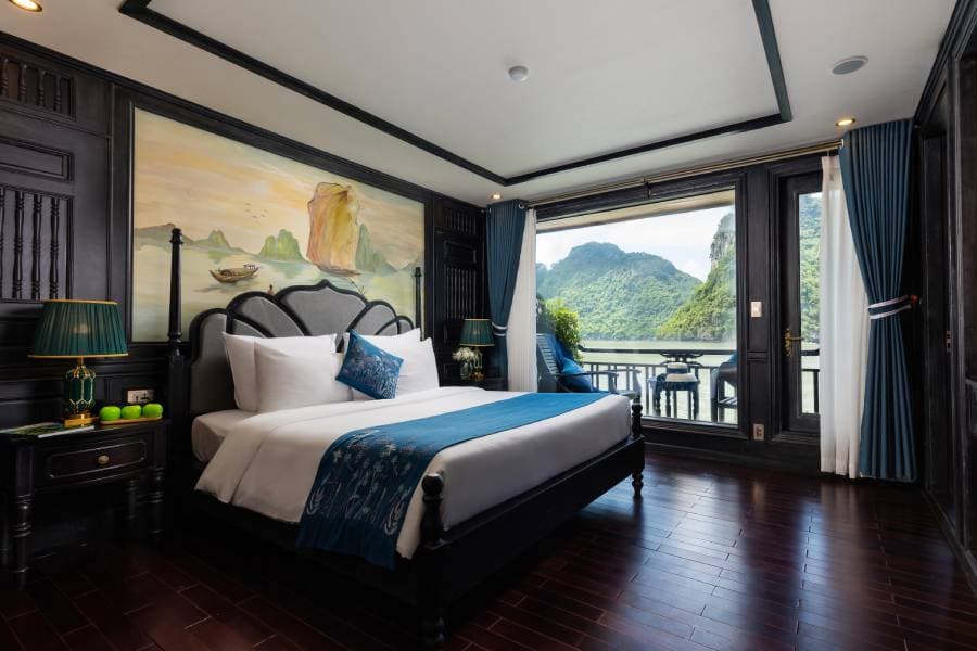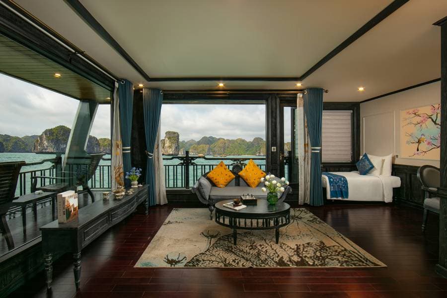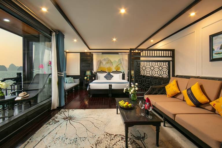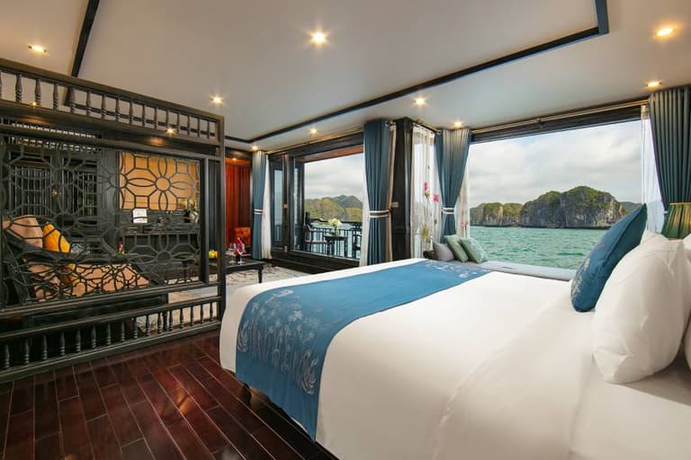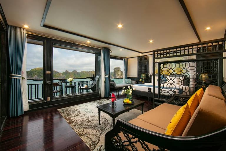 Inspired by the refined colonial Indochina of the 1930s, the La Regina Grand Cruise presents a design of enduring sophistication. Its generously sized suites, featuring expansive floor-to-ceiling windows and private balconies, showcase the stunning panorama of Lan Ha Bay. These suites provide a serene retreat, blending timeless aesthetics with contemporary luxuries and personalized service.