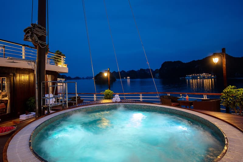 Orchid Classic Cruises elevates the Halong Bay experience with its exceptional public amenities, complementing its luxurious private cabins. Guests can indulge in beauty spa services, themed parties, limousine transfers, and enjoy a well-equipped gym, bar, and restaurant. A diverse range of thrilling activities, including kayaking, sunbathing, squid fishing, cave and island exploration, and cooking lessons, await on this unforgettable journey.